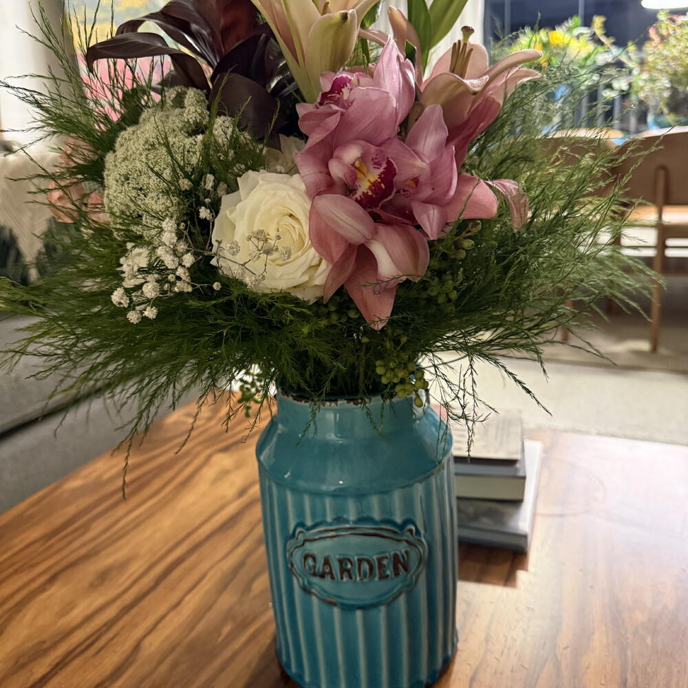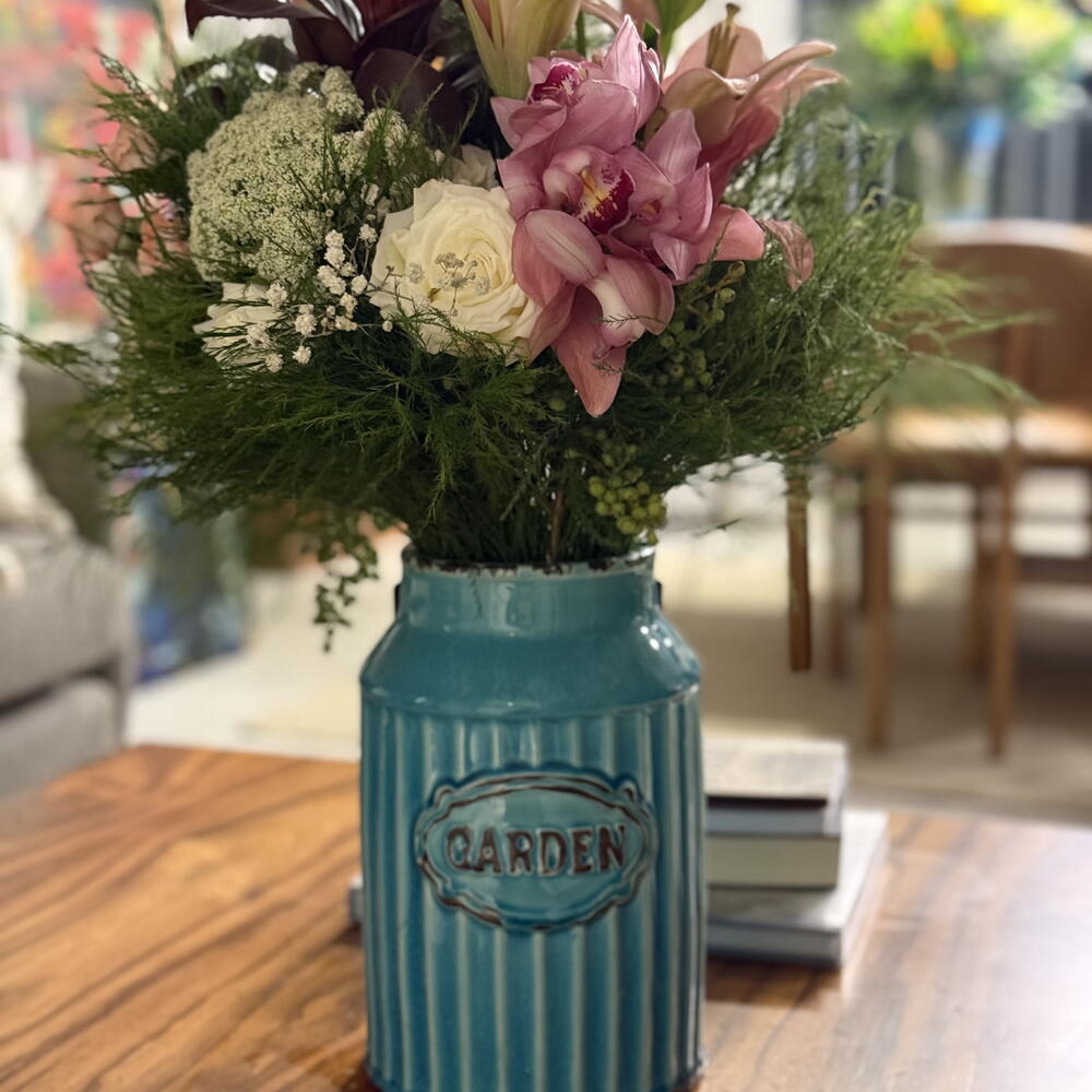 Este arranjo de flores em vaso é composto por flores vibrantes e folhagens exuberantes, cuidadosamente alocados em um vaso de cerâmica artesanal. Ideal para decorar qualquer ambiente, trazendo um toque de elegância e aconchego. Através dessa peça única, é possível transformar instantaneamente o seu espaço com a alegria e a beleza que só as flores podem proporcionar. Além disso, o vaso de cerâmica acrescenta uma doce rusticidade a este item, tornando-o uma opção perfeita para presentear ou decorar a sua própria casa.