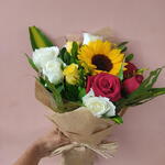 Deixe a beleza do sol invadir o ambiente com este arranjo de flores composto por um girassol radiante, cercado por nove rosas exuberantes. Complementando a harmonia desta composição, também incluímos uma folhagem decorativa para proporcionar um toque de verde fresco. Tudo isso é cuidadosamente acondicionado em uma embalagem personalizada, pronta para surpreender e encantar em qualquer ocasião.