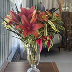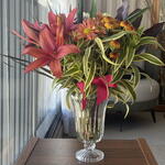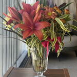 folhagens - 1 pcs vaso de vidro - 1 pcs flores variadas (lírio e gerberas) - 1 pcs