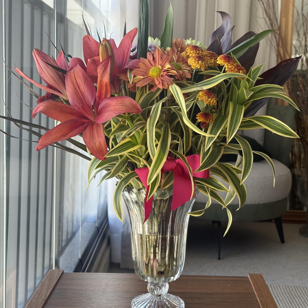 Experiencie a beleza natural e a alegria vibrante deste lindo vaso de flores. Este arranjo floral cuidadosamente trabalhado contém lirios e gerberas variadas unidas em harmonia. Complementado por exuberantes folhagens, a atraente combinação é organizada habilmente num vaso de vidro elegante. Uma adição perfeita para transmitir tranquilidade e beleza ao seu ambiente, ou um presente tocante para alguém especial.