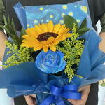 Este arranjo de flores sofisticado compreende elementos requintados, como um girassol singular, que acrescenta um toque de cor e energia a qualquer ambiente. Ele é cuidadosamente complementado por uma rosa azul tingida, fornecendo um contraste dramático e refinado. Tango e duas folhagens de ruscos adicionam textura e profundidade ao arranjo, enquanto enfatizam suas cores vibrantes. Por último, mas não menos importante, incluímos uma reprodução do quadro de Van Gogh para conferir a este arranjo uma aura de requinte artístico. Este é o presente ideal para os apreciadores de arte e amantes de flores.