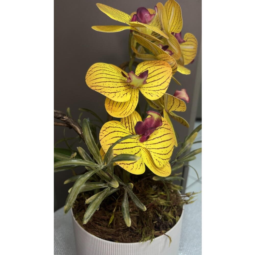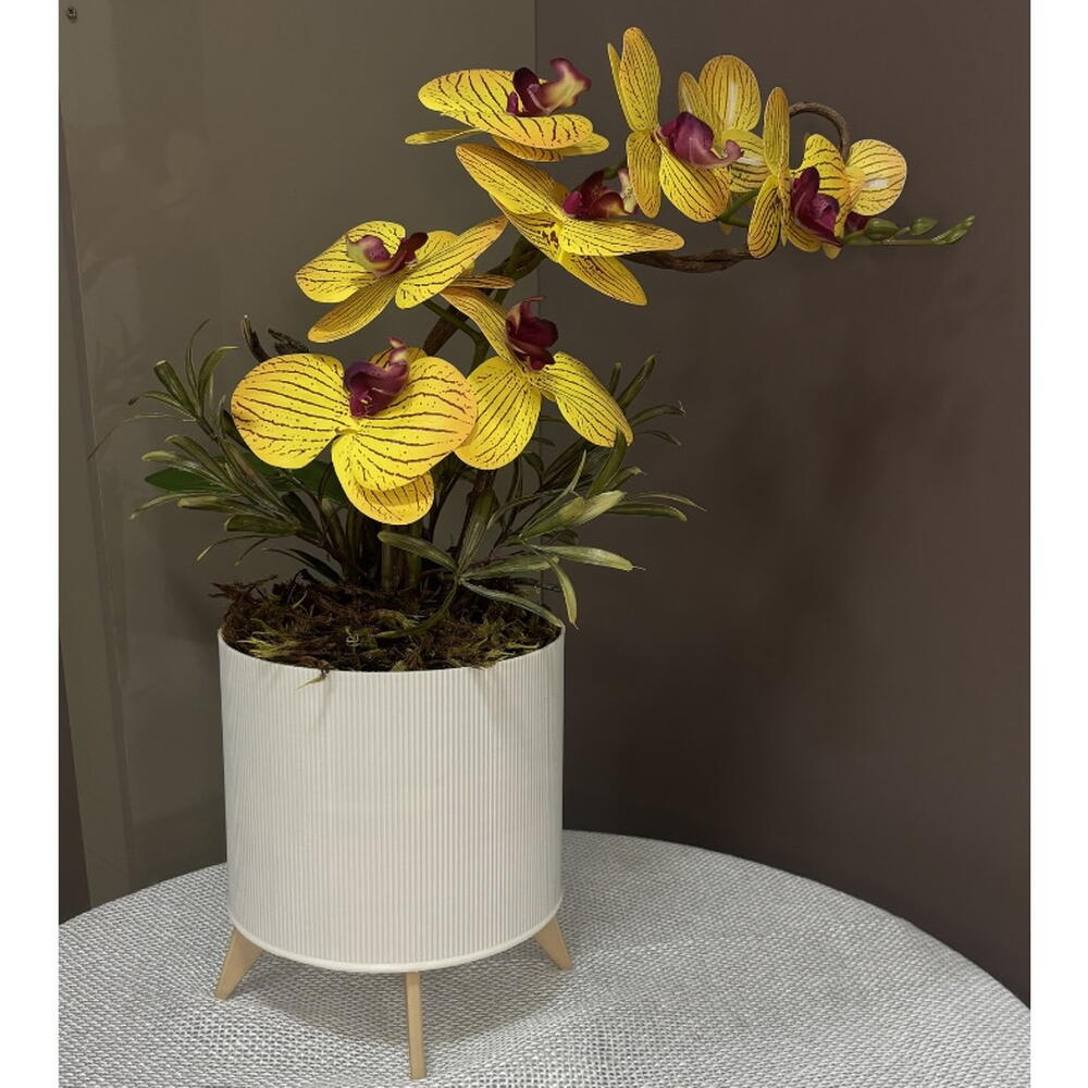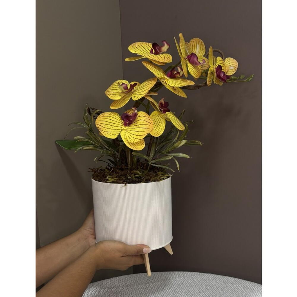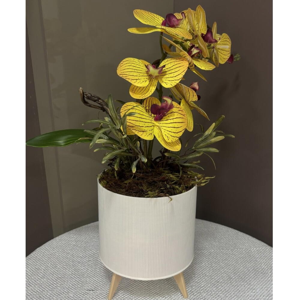 arranjo de orquídea amarela permanente - 1 pcs vaso bege texturizado com pés de 4 apoios - 1 pcs