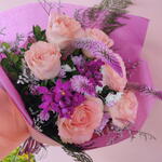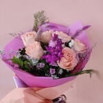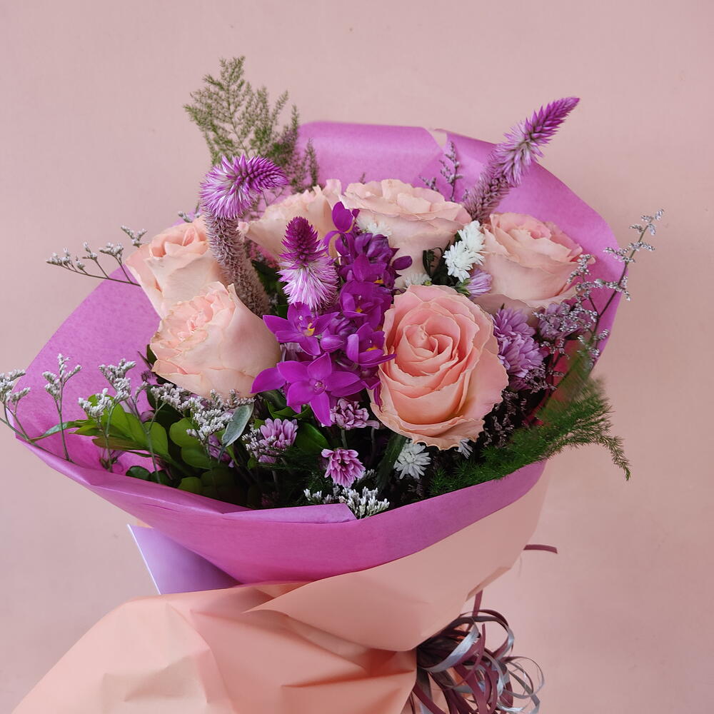 Este arranjo encantador é composto por seis delicadas rosas cor de rosa, harmoniosamente combinadas com belas folhagens em tom lilás. Uma combinação de cores suaves e agradáveis que traz um toque de romantismo e sofisticação. Perfeito para decorar qualquer ambiente ou para presentear alguém especial.