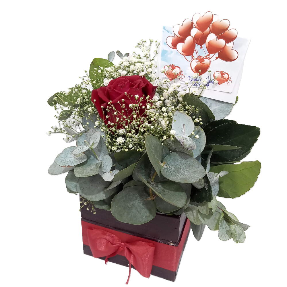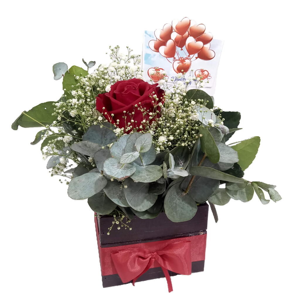Este encantador arranjo de flores apresenta uma Rosa Vermelha Colombiana de alta qualidade, enriquecida por diferentes tons verdes de Folhagens e Eucalipto. Apreciada ainda mais pela presença delicada de Mosquitinhos, dando um toque adicional de beleza e elegância. Toda essa composição é delicadamente acomodada em uma bela caixa de madeira, complementada por um laço decorativo feito com uma fita de cetim. É a escolha perfeita para expressar sentimentos profundos e marcar momentos especiais.