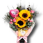 laço - 1 pcs embalagem celofane - 1 pcs lindo balão - 1 pcs caixa chocolate ferrero rocher 50gr - 1 pcs lindo arranjo de 2 girassol naturais - 1 pcs