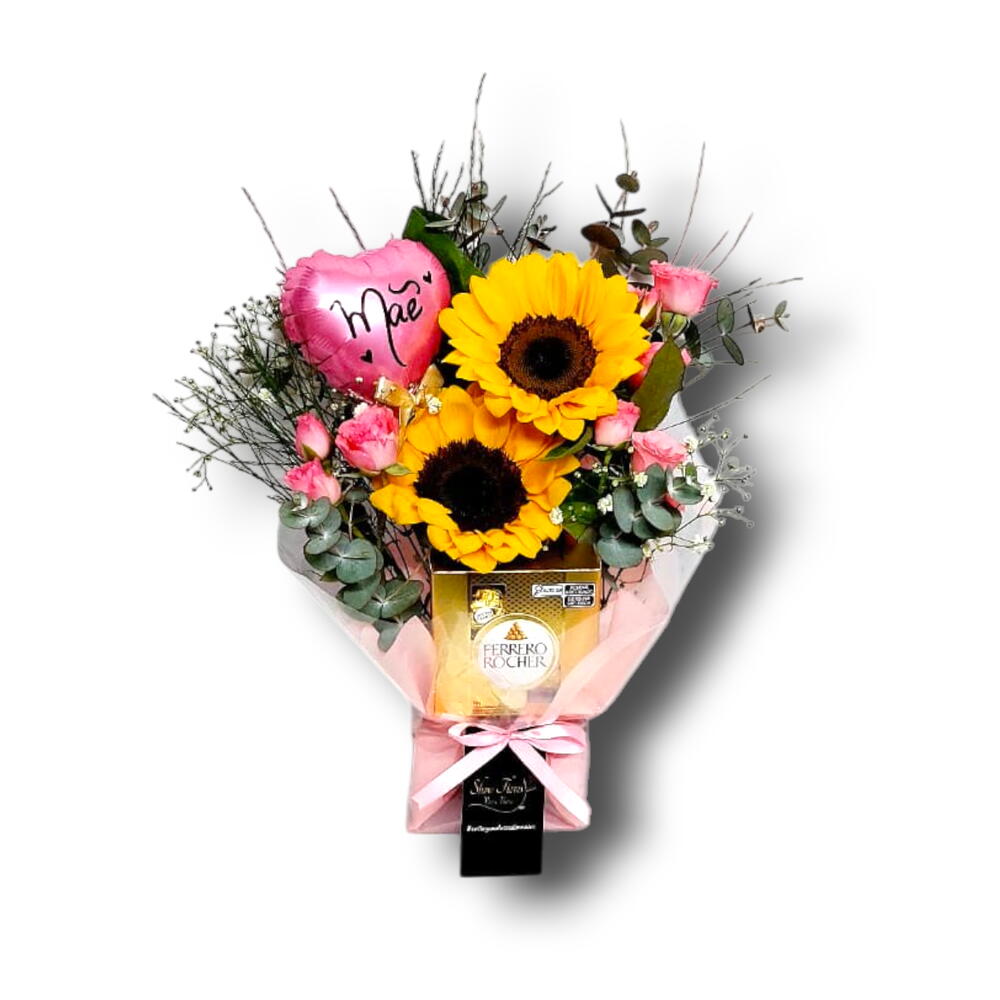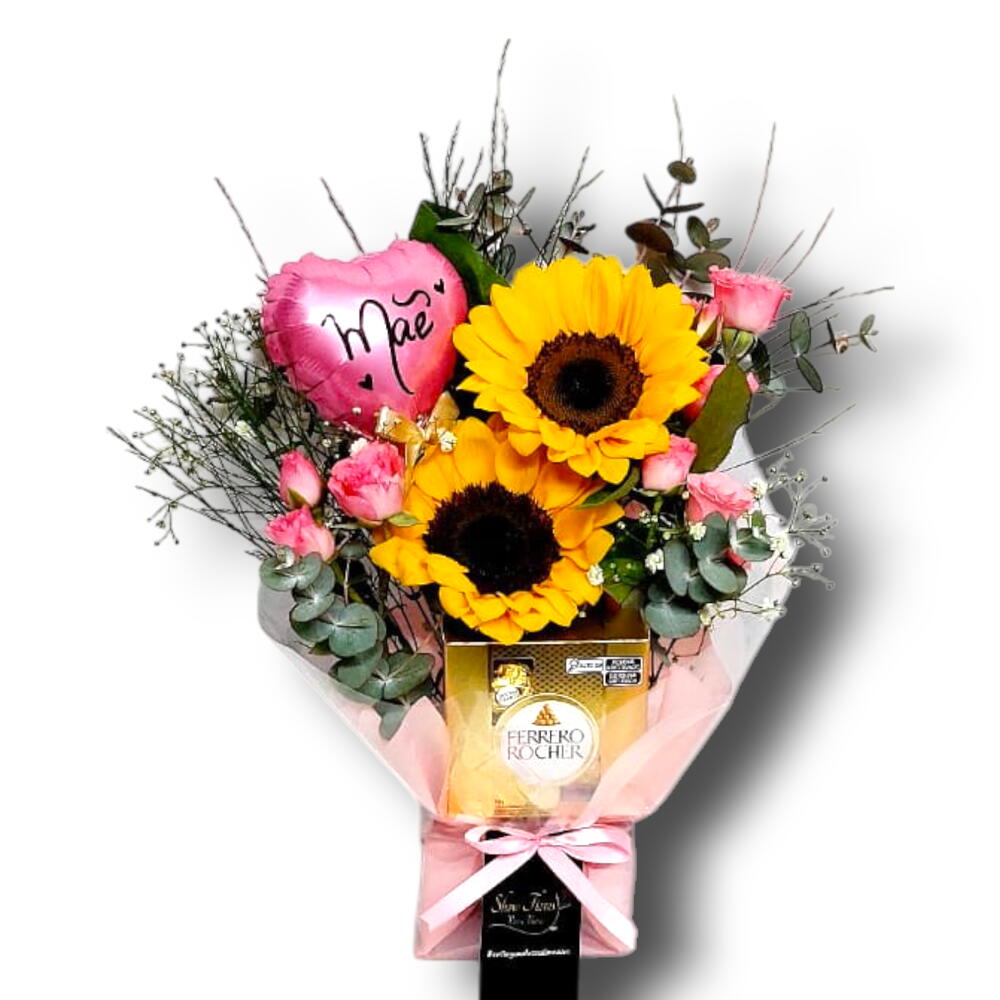 laço - 1 pcs embalagem celofane - 1 pcs lindo balão - 1 pcs caixa chocolate ferrero rocher 50gr - 1 pcs lindo arranjo de 2 girassol naturais - 1 pcs
