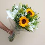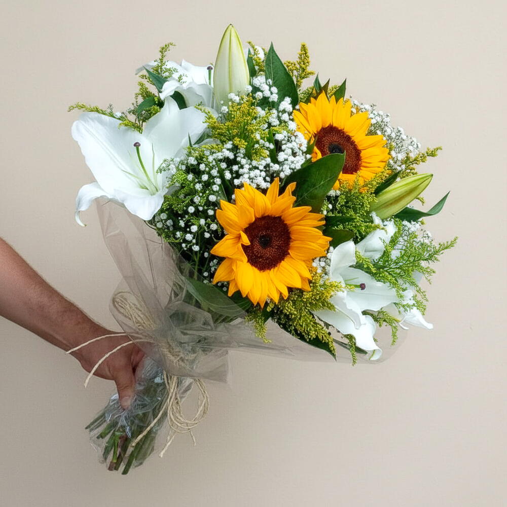 Este charmoso buquê é composto por uma bela combinação de 1 lírio e 2 girassóis. Os lírios representam pureza e virtude, enquanto os girassóis simbolizam alegria e felicidade. Uma escolha perfeita para celebrar momentos especiais ou simplesmente para trazer um sorriso ao rosto de alguém. Um encantador presente ao natural, ideal para iluminar qualquer ambiente.