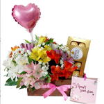 embalagem - 1 pcs laço - 1 pcs caixa de madeira - 1 pcs mini balão - 1 pcs arranjo de alstroemerias coloridas - 1 pcs caixa ferrero rocher com 8 (100gr) - 1 pcs