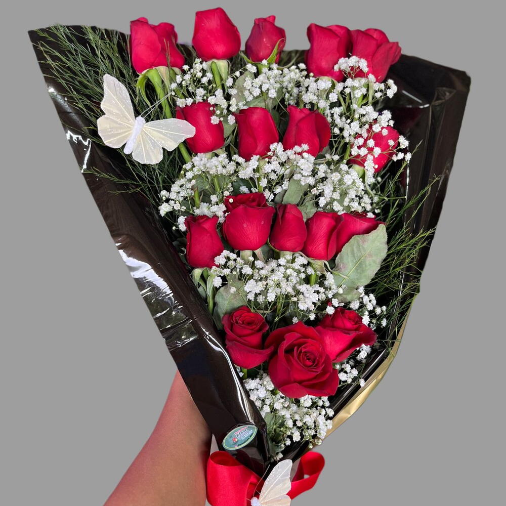 Lindo bouquet em formato de cascata com 18 rosas nas cores a sua escolha , em uma linda embalagem que você pode escolher a cor e duas lindas borboletas para decorar!