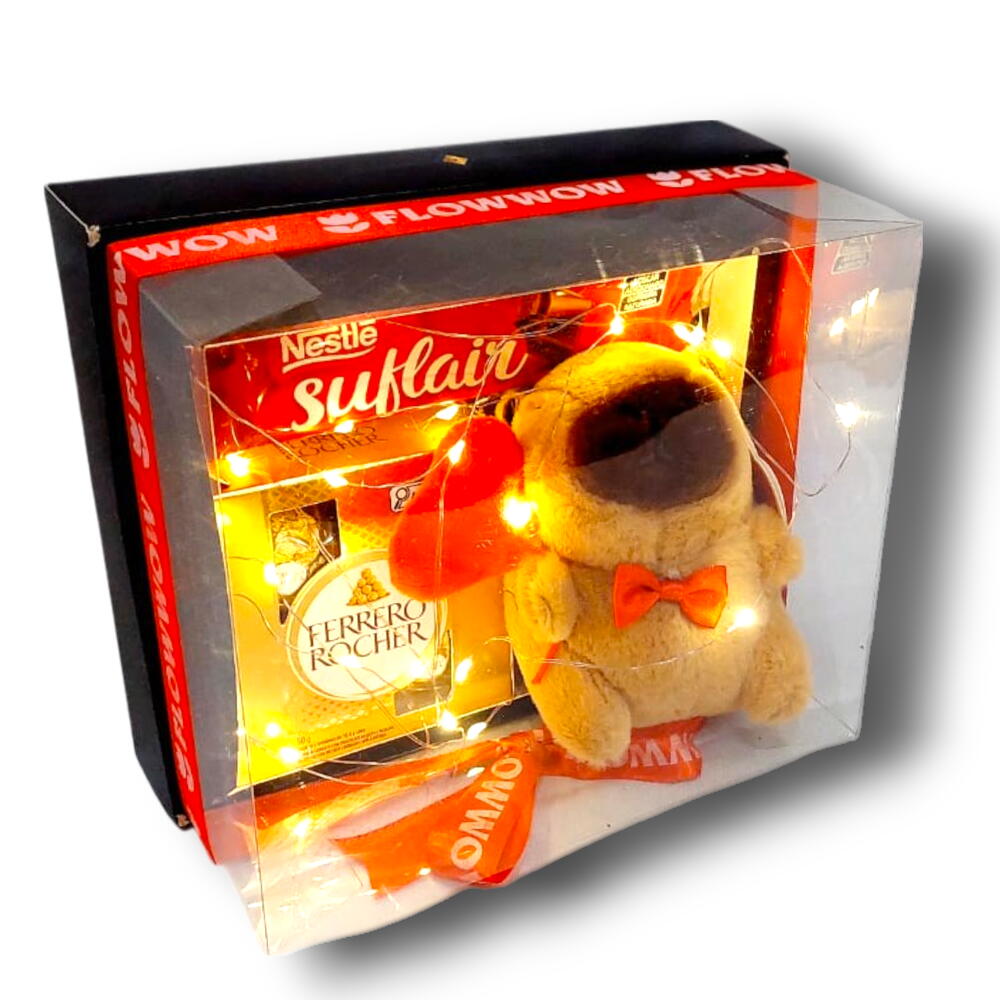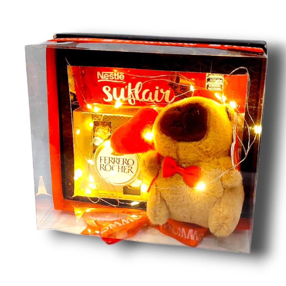 chocolate suflair 50gr - 1 pcs linda caixa de presente - 1 pcs caixa de bombom ferrero rocher 50gr - 1 pcs linda pelucia capivara (chaveiro - 12 cm) - 1 pcs lindo fio led iluminação - 1 pcs