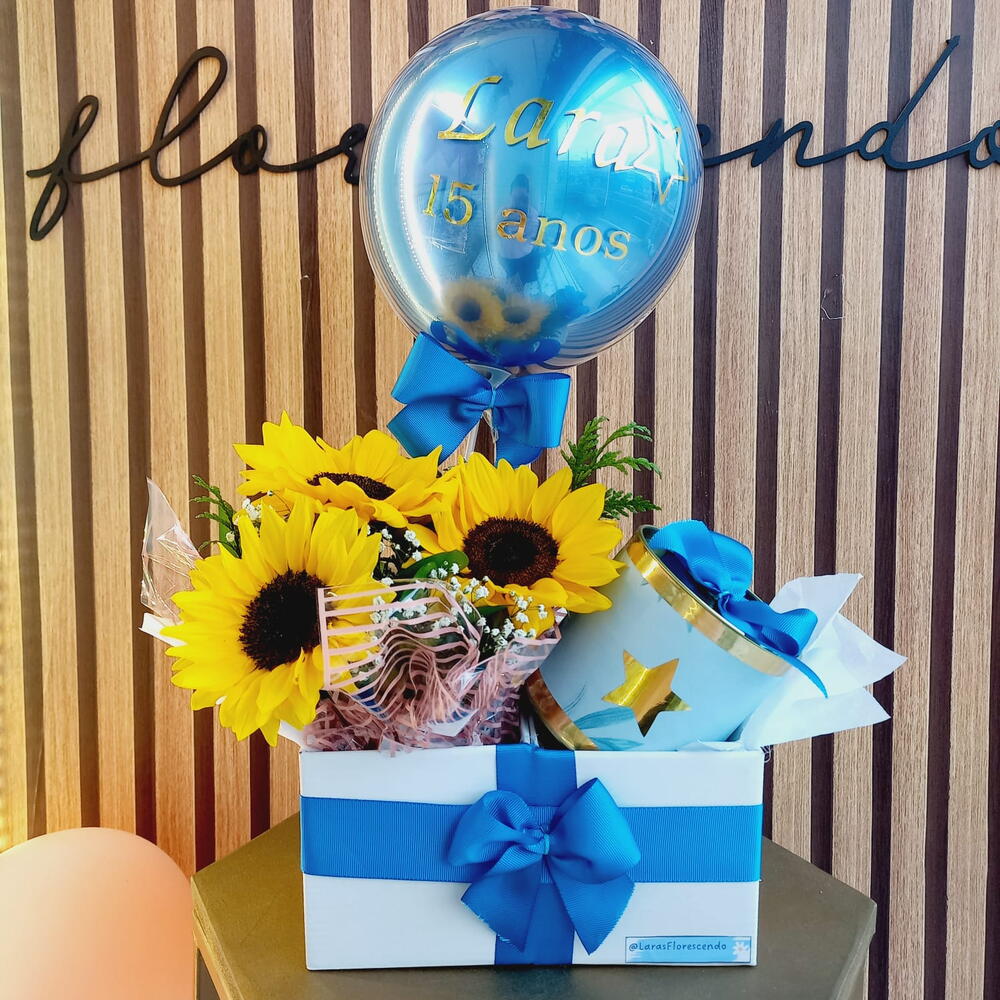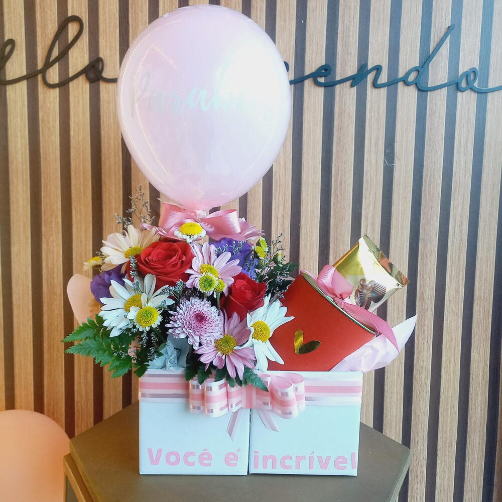 Surpreenda alguém especial com uma caixa repleta de encanto: arranjo floral elegante, deliciosos cookies e chocolates Talentos, além de uma Bubble repleta de felicitações. Em uma embalagem especial e decorada, acompanha também um cartão de felicitações. Presenteie com amor! OBS: * A cor da embalagem pode variar de acordo com o estoque. * O arranjo pode variar de acordo com a disponibilidade das flores.