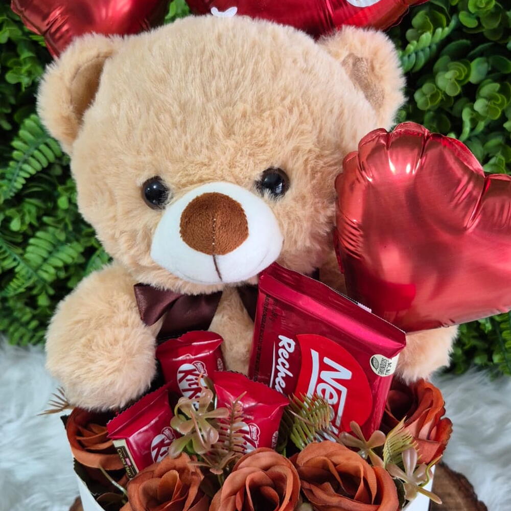 balão de coração - 3 pcs flores permanentes - 1 pcs box cartonada - 1 pcs urso de pelúcia 30 cm - 1 pcs barra de chocolate ao leite - 1 pcs mini kit ket - 3 pcs