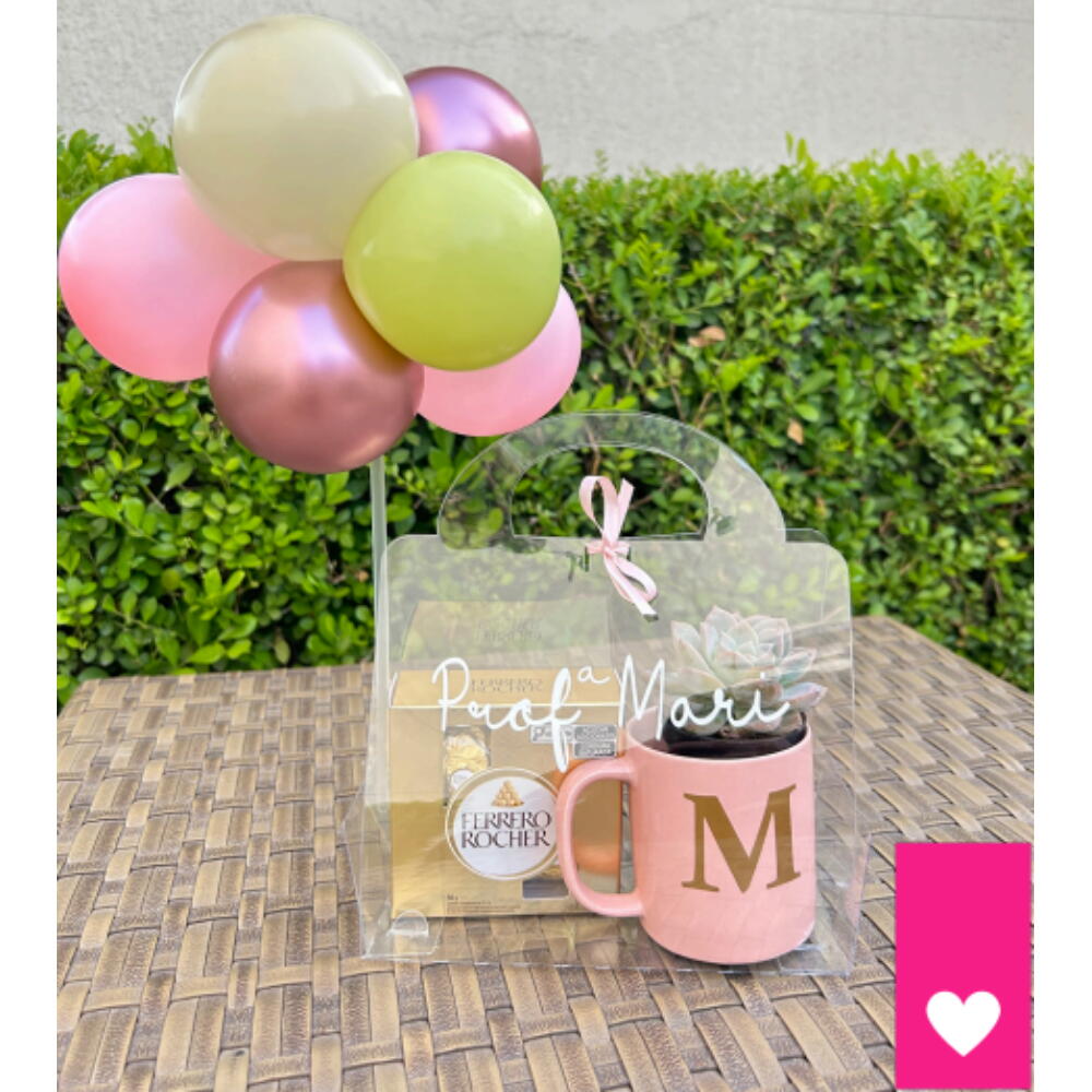Este encantador conjunto de Flores e Chocolate é perfeito para quem deseja tornar qualquer ocasião especial! Ele traz uma caneca pequena personalizada com a inicial do seu escolhida, enchendo seu dia de individualidade e charme. Junto com ela, aproveite o irresistível estojo de Ferrero Rocher para adicionar um toque doce ao seu momento. O kit vem ainda com uma suculenta, trazendo um pouco de natureza para sua casa, e um buquê de mini balões que fazem tudo ficar ainda mais festivo e cheio de alegria. Tudo isso é cuidadosamente embalado em uma bolsa de cristal para garantir que chegue em perfeito estado à sua porta. Experimente esta combinação emocionante de beleza, doçura e personalização!