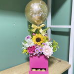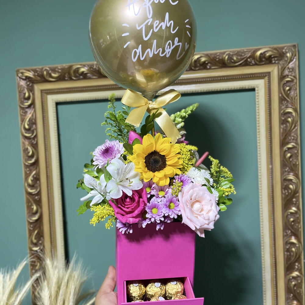 Este é um presente verdadeiramente encantador que combina a beleza delicada de um mix floral e a folhagem especial, juntamente com a surpresa alegre de um balão. Aclamado por um laço em cetim, este presente é acentuado por três deliciosos Ferrero Rocher, todos apresentados em uma caixa personalizada com gaveta, tornando-o um presente ideal para qualquer ocasião.