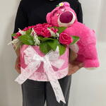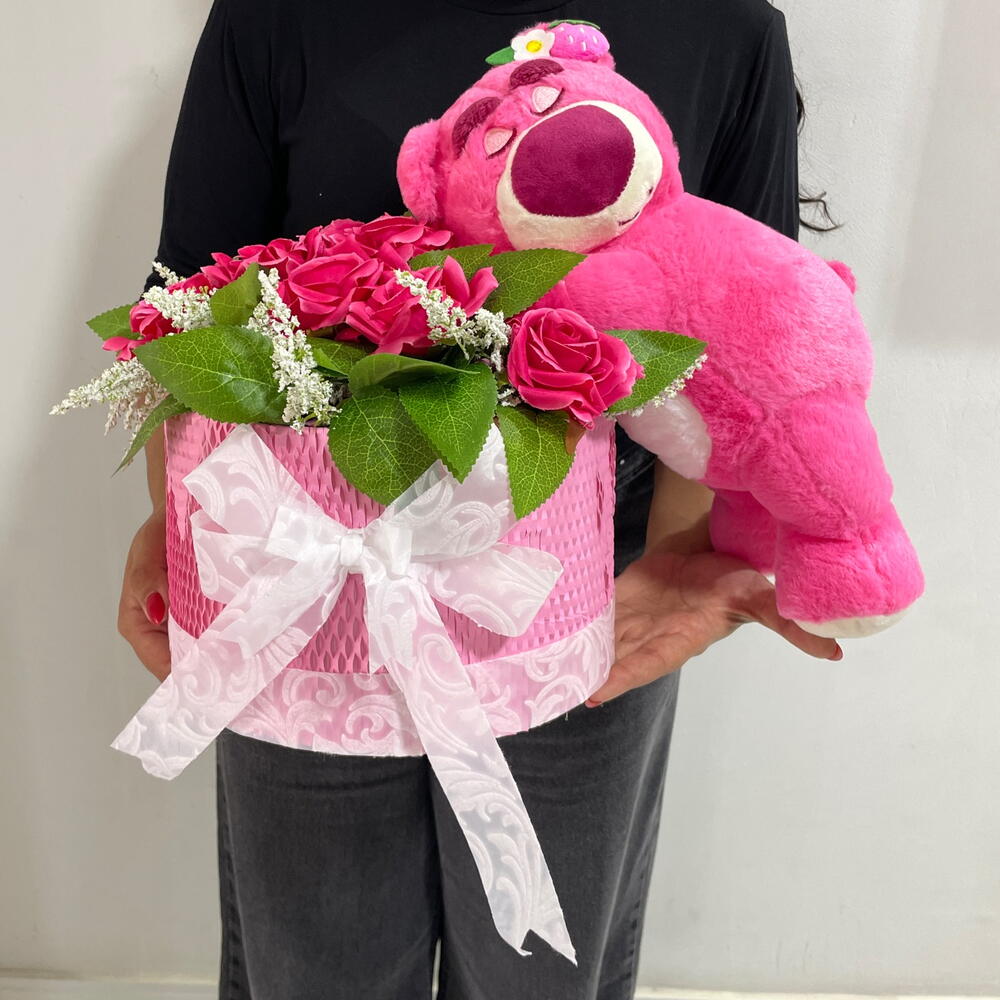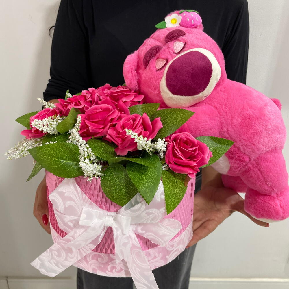 flores permanentes - 1 pcs box redonda com laço de fita - 1 pcs pelúcia 40cm - 1 pcs