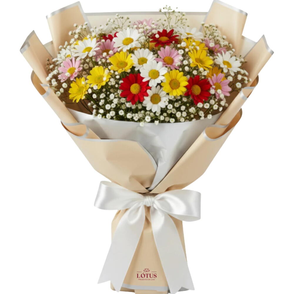 Nosso Buquê de Margaridinhas Coloridas é um convite para sorrir. Com suas pétalas brancas e centros coloridos, essas margaridas são a personificação da alegria e da simplicidade. É o presente ideal para celebrar momentos felizes, expressar gratidão ou simplesmente alegrar o dia de alguém com a beleza da natureza.