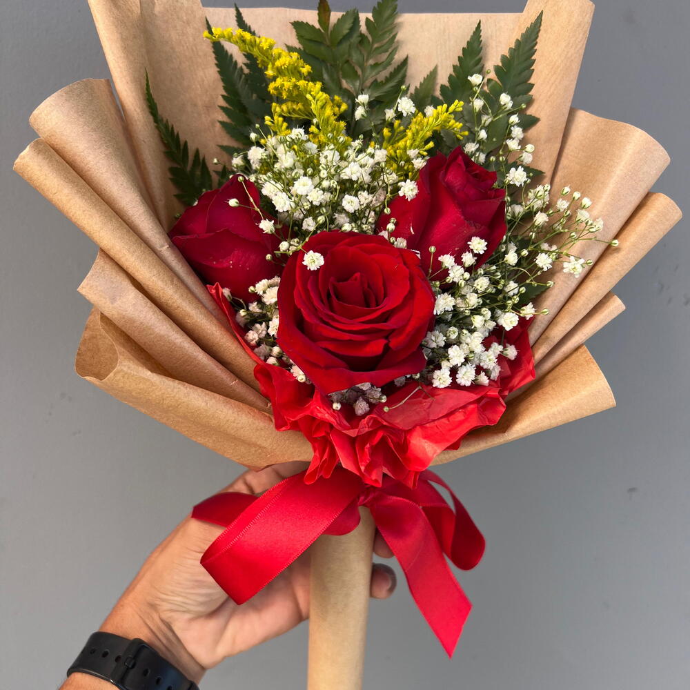 Este deslumbrante buquê é composto por 3 exuberantes rosas, delicadamente arranjadas entre folhagens frescas. Cada buquê é cuidadosamente envelopado em uma embalagem inspirada na elegância coreana e finalizado com um sofisticado laço de cetim. Uma escolha perfeita para expressar os seus sentimentos mais profundos.