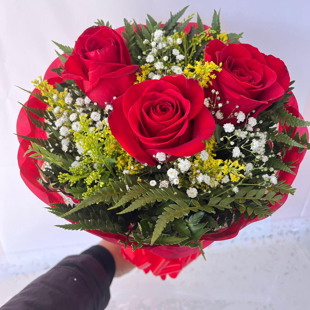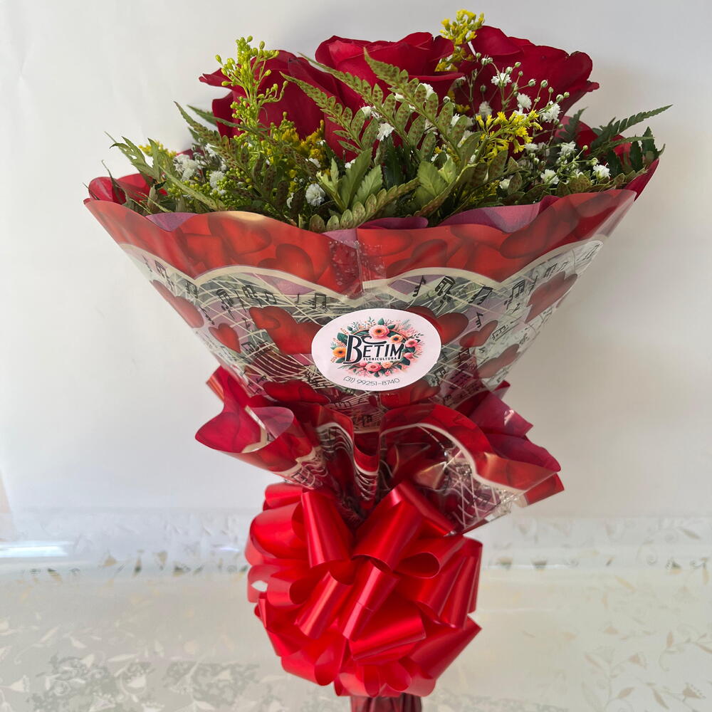 Apresentamos um elegante buquê eloquentemente decorado com 3 rosas vermelhas vibrantes, emolduradas por uma folhagem verde luxuriante. Este arranjo floral é habilmente embalado em uma embalagem de alta qualidade e finalizado com um laço sofisticado, garantindo uma apresentação impressionante. Uma escolha perfeita para expressar seu amor e apreço carinhoso.