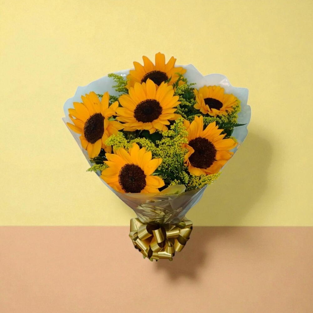 Este deslumbrante buquê apresenta 6 girassóis belamente arranjados, complementados por uma luxuosa folhagem para criar uma atmosfera encantadora. O buquê é elegantemente embalado juntamente com um laço sofisticado, adicionando um toque de elegância a este assemblage floral. Perfeito para aniversários, ocasiões especiais ou simplesmente para iluminar o dia de alguém.