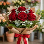 Buquê de 6 rosas vermelhas de alta qualidade e caules longos embalados em um papel Kraft estilo francês. Presentei com todo frescor e qualidade que só a Web Flowers carrega.