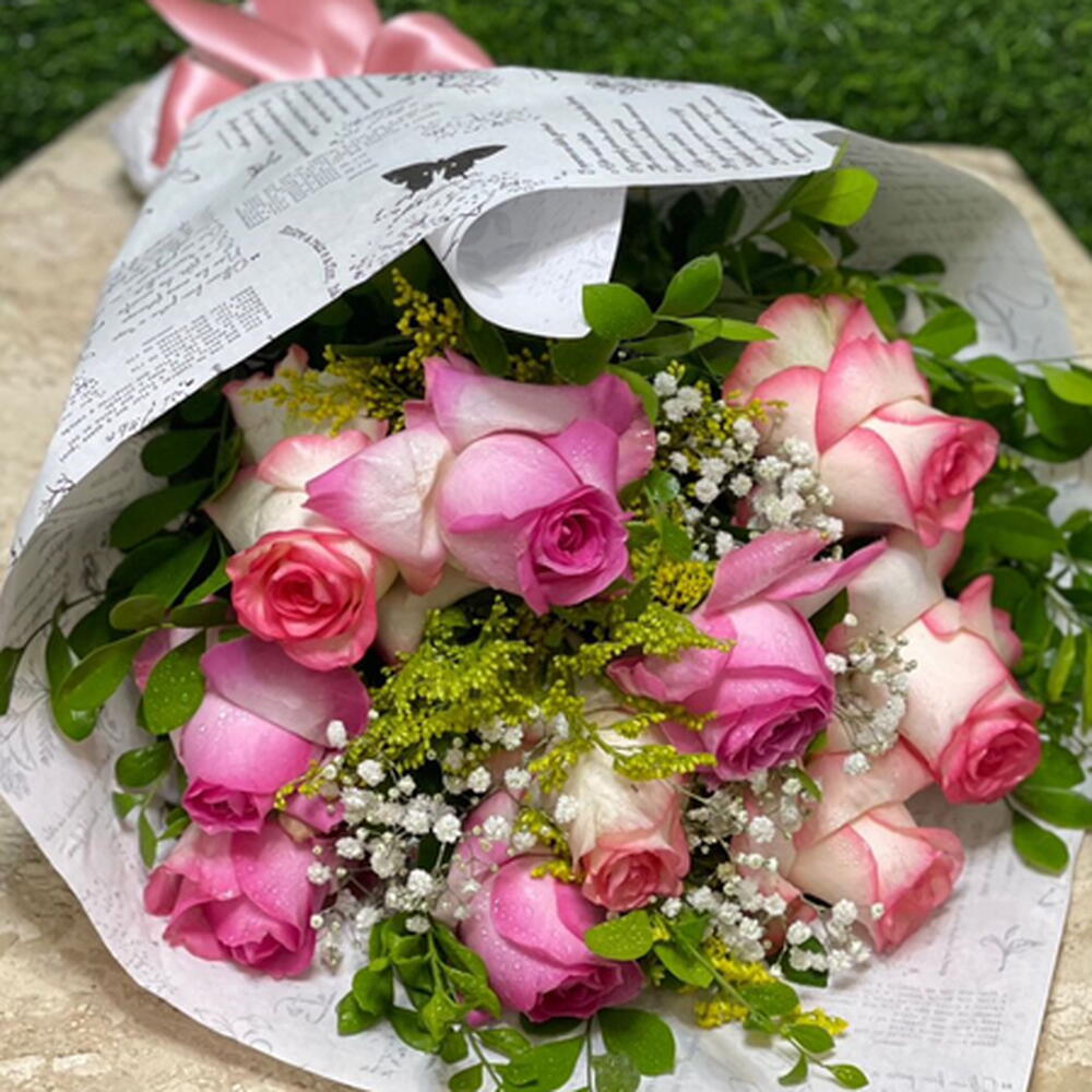 tango - 1 pcs laço em cetim - 1 pcs gipsófila e folhagens - 1 pcs rosa em tons de rosa - 9 pcs embalado em papel jornal floral - 1 pcs