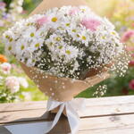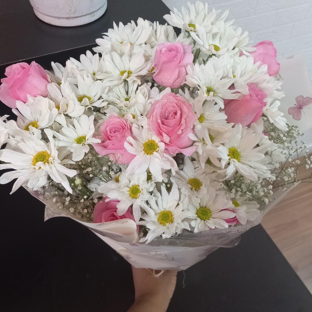 Deleite-se com nosso buquê feito com cuidado e carinho, composto por margaridas e rosas frescas e vibrantes. Combinando 10 destas lindas flores, este buquê exala delicadeza e beleza naturais. Perfeito para ocasiões especiais ou simplesmente para alegrar o dia de alguém.