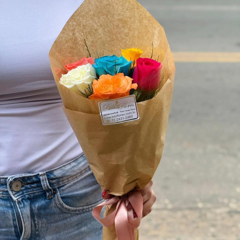 Composto por 6 rosas em tonalidades vibrantes (rosa, pink, azul, branco, amarelo e laranja), o buquê Arco-íris é aquele presente que ilumina o dia e espalha felicidade logo no primeiro olhar. Um buquê leve, alegre e cheio de vida, perfeito para transmitir carinho de forma espontânea.✨🌈 Embalado com acabamento delicado, um presente versátil, feito para celebrar os momentos simples e especiais do dia a dia. Ideal para aniversários, agradecimentos, pequenas comemorações ou simplesmente para surpreender sem motivo! Composição: - 6 rosas nacionais coloridas frescas (as cores podem variar conforme a disponibilidade) - Aspargo - Embalagem decorativa de kraft e laço de cetim Durabilidade: As rosas possuem durabilidade média de 5 a 7 dias, podendo variar conforme os cuidados e condições do ambiente, mantendo a beleza e o frescor por mais tempo.