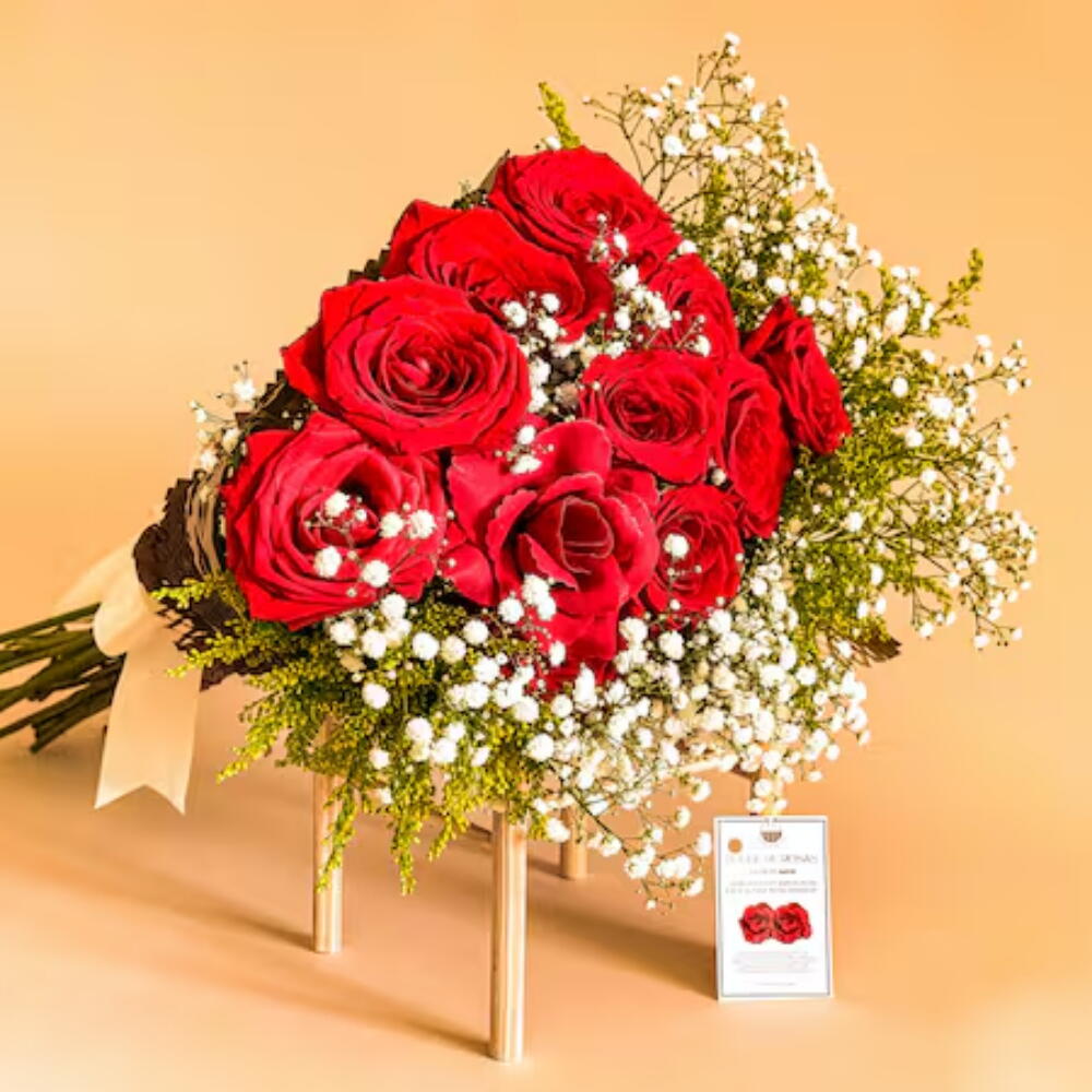 Celebre momentos especiais com este elegante buquê, perfeitamente arranjado com 9 rosas naturais, evidenciando uma única rosa sintética como destaque. Este charmoso buquê vem cuidadosamente empacotado e adornado com delicadas folhagens e complementos. A embalagem incluída exibe um toque sofisticado, e o laço finaliza a apresentação com graça e elegância. Um presente memorável para qualquer ocasião.
