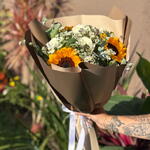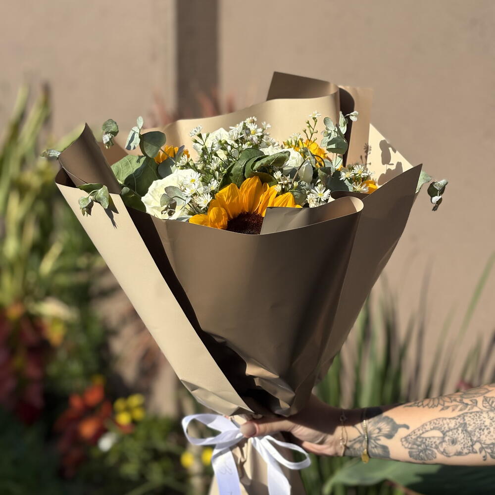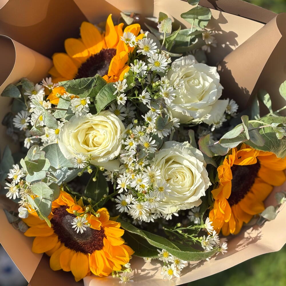 Este buquê maravilhosamente composto inclui uma trindade de unidade para cada flor - 3 girassóis vibrantes e 3 rosas brancas radiantes, envoltos em uma embalagem elegante e adornadas com um laço grande. Para completar a apresentação, uma unidade de folhagens e complementos (hastes) é habilmente arranjada para realçar a beleza natural das flores. Este buquê é o presente perfeito para expressar o amor, a admiração ou para celebrar ocasiões especiais.