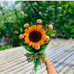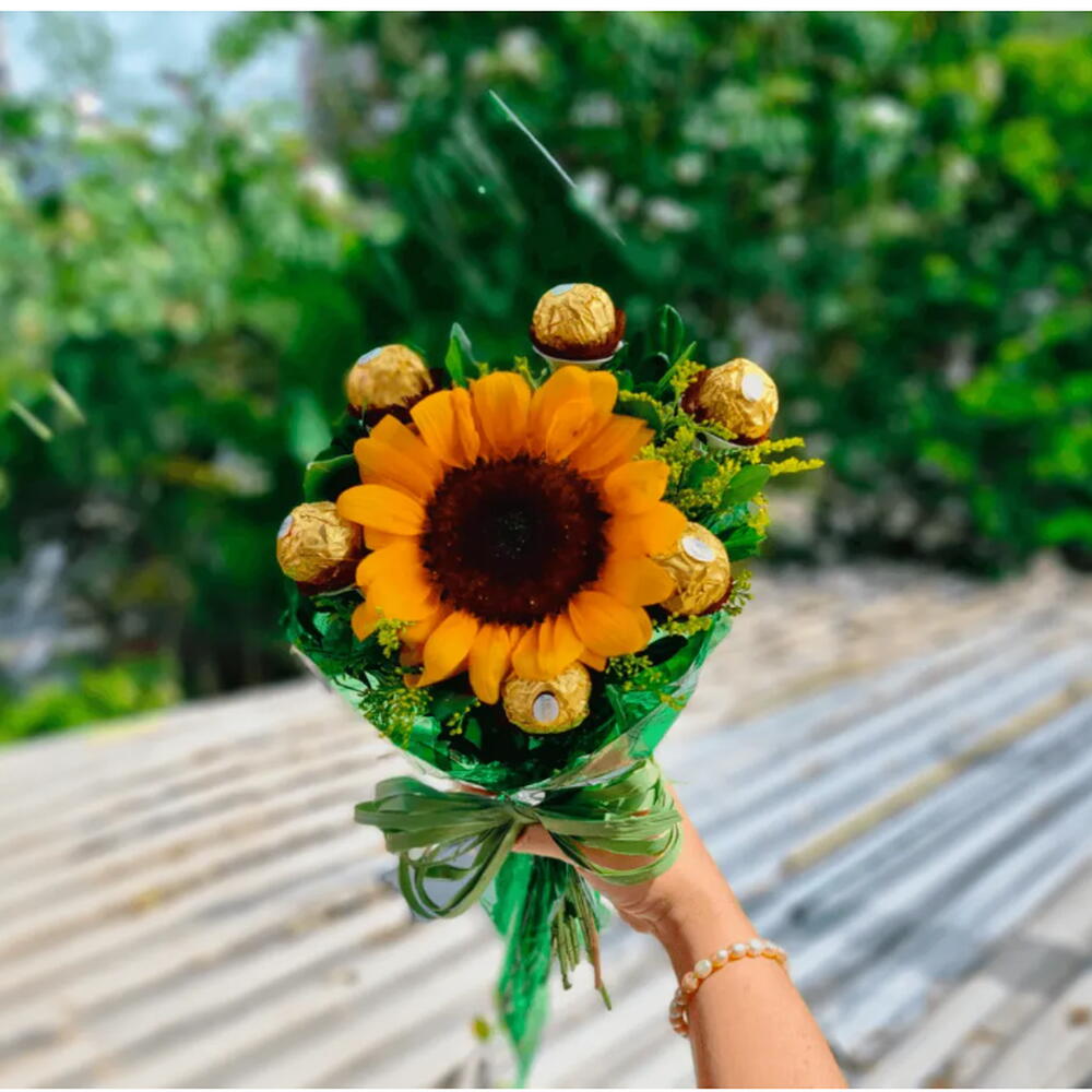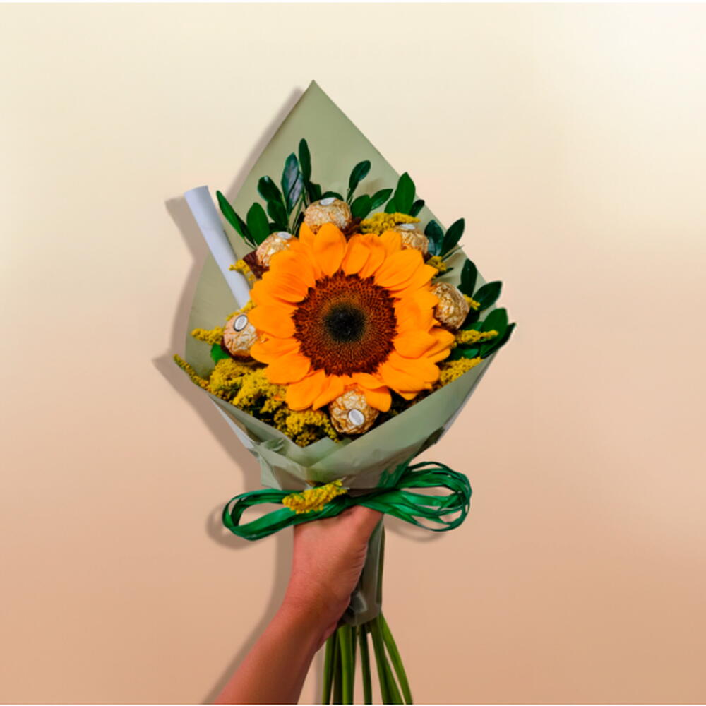 O Buquê Brasileirinho é uma celebração das cores e sabores do Brasil! Composto por um deslumbrante girassol e 6 irresistíveis chocolates Ferrero Rocher, este buquê é uma ode à alegria e à doçura. Embalado na vibrante cor verde, que contrasta lindamente com o amarelo do girassol e o dourado dos chocolates, é uma verdadeira festa visual! Além disso, para tornar este presente ainda mais especial, incluímos uma cortesia: um texto personalizado, enviado em uma linda cartinha, para expressar seus sentimentos de forma única. Celebre e homenageie o(a) brasileiro(a) que você adora com o Buquê Brasileirinho da Oficina de Cestas e Flores. Uma explosão de cores e sabores para alegrar qualquer coração!