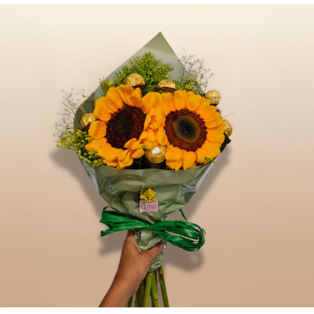 2 girassol naturais frescos e radiantes - 1 pcs 6 chocolates ferrero rocher premium fixados em hastes elegantes integradas ao buquê - 1 pcs