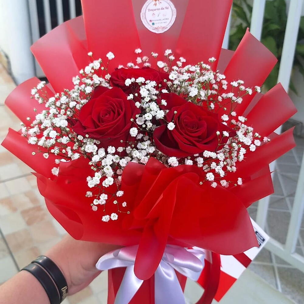 Contém 3 Rosas Colombianas Mosquitinhos Embalagem Coreana Vermelha Acompanha cartão