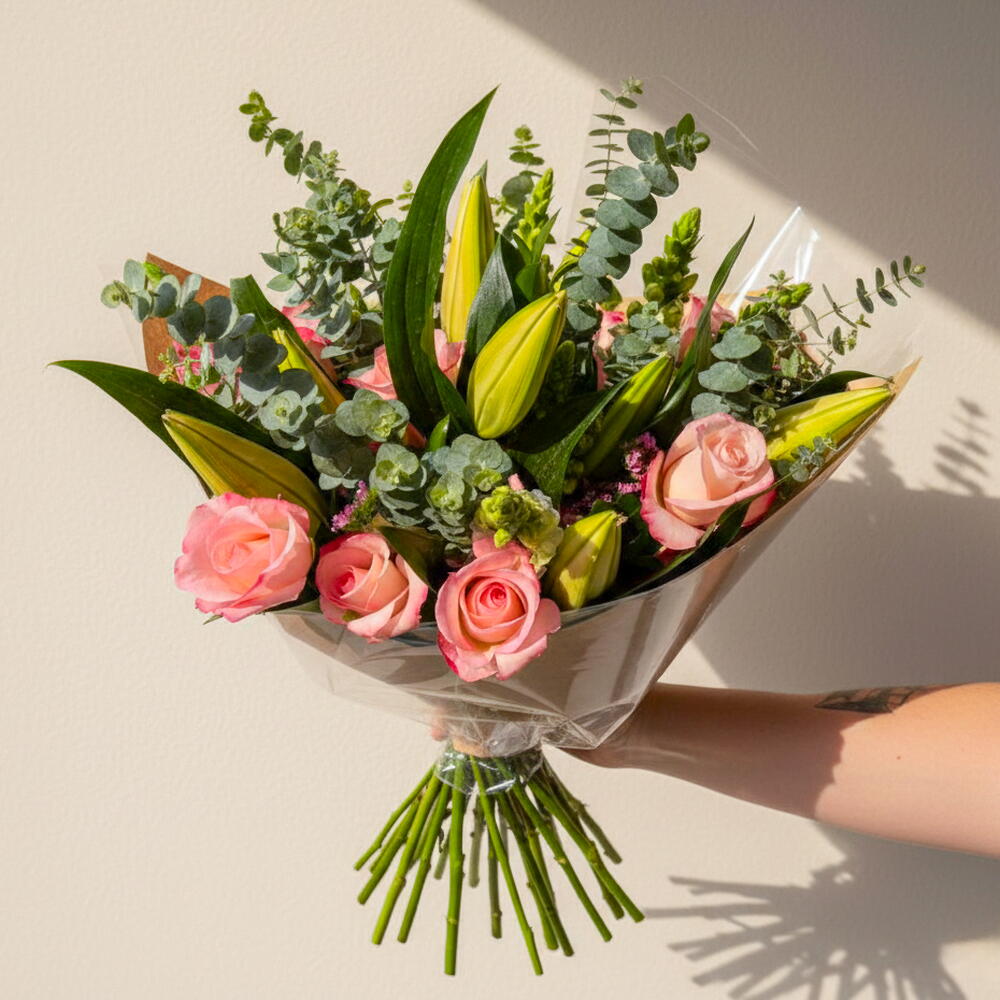 Este buquê elegante e vibrante é composto por 12 rosas ricas, seis lírios deslumbrantes, e cinco boca de leão brilhantes, todos magnificamente realçados com o verde fresco de um galho de eucalipto. Uma combinação requintada de beleza natural e criatividade floral, este buquê é perfeito para qualquer ocasião e é garantido para trazer encanto e alegria para o destinatário.