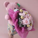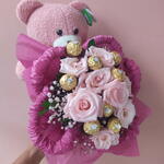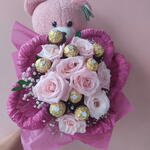 rosa - 8 pcs embalagem personalizada - 1 pcs ferrero rocher - 7 pcs ursinho - 1 pcs laço - 1 pcs mosquitinhos - 1 pcs cachepo decorado - 1 pcs