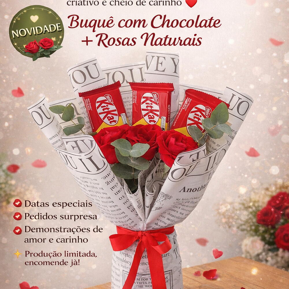 Desperte os sentidos com este lindo buquê, composto por três rosas vermelhas vibrantes e luxuosas, simbolizando o amor ardentemente apaixonado. Além das flores, o buquê também traz a surpresa dos chocolates Kit Kat, um trio de prazer crocante que satisfaz cada desejo. É o presente perfeito que mistura a elegância das rosas com o sabor irresistível do chocolate.