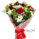Adicione um toque de charme a qualquer ocasião com este deslumbrante buquê. Cuidadosamente arranjado com a perfeição de 4 rosas, acoplado com a beleza exuberante de uma folhagem verde, a delicadeza da gipsofila branca e o encanto do crisântemo ou flores do campo, este buquê é uma verdadeira obra de arte. Envolto em uma embalagem de celofane, adornado com uma fita ou laço delicado e acompanhado de um cartão de mensagem, ele se transforma em um presente excepcional. Esta composição é ideal para expressar sentimentos de amor, apreciação e carinho. Não importa a ocasião, este buquê certamente encantará o destinatário!