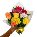 DESCRIÇÃO Buquê pequeno com 6 rosas e astromélias coloridas, ideal para gestos delicados e cheios de significado. Uma composição charmosa e vibrante para surpreender com carinho, alegria e beleza em qualquer ocasião. OBSERVAÇÕES Atenção: A imagem apresentada deste arranjo é similar ao produto que será oferecido, podendo haver variações em suas características. *cores altera conforme estoque*