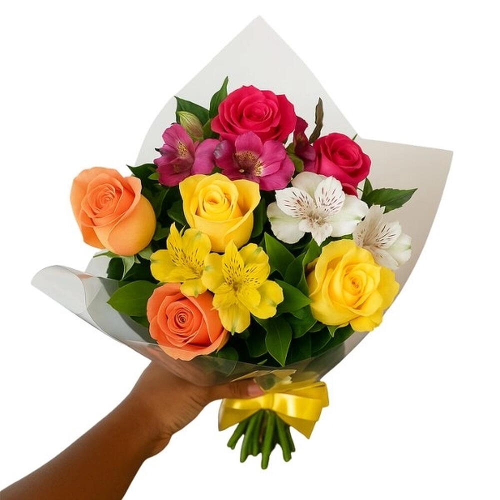 DESCRIÇÃO Buquê pequeno com 6 rosas e astromélias coloridas, ideal para gestos delicados e cheios de significado. Uma composição charmosa e vibrante para surpreender com carinho, alegria e beleza em qualquer ocasião. OBSERVAÇÕES Atenção: A imagem apresentada deste arranjo é similar ao produto que será oferecido, podendo haver variações em suas características. *cores altera conforme estoque*