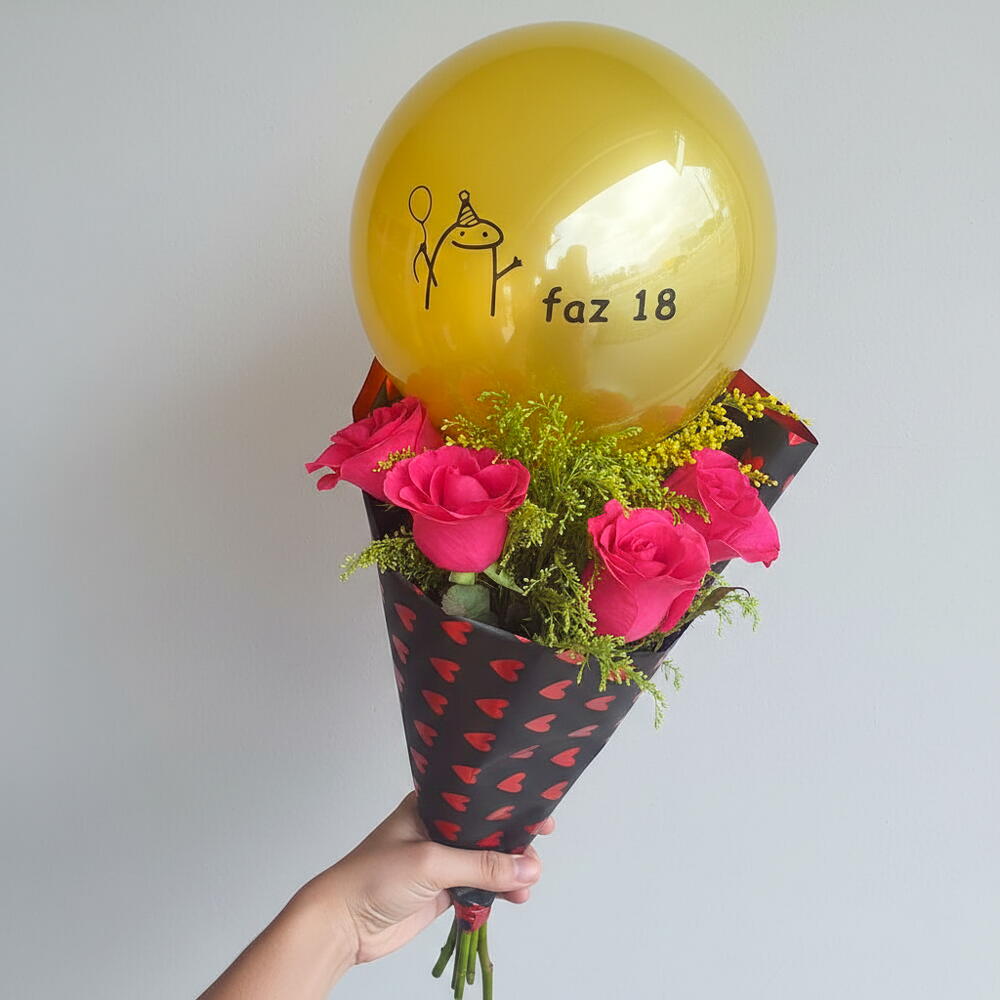Este encantador buquê é composto por três adoráveis rosas, delicadamente colocadas entre folhagens. O arranjo vem cuidadosamente embalado e é decorado com um laço para dar um toque final de elegância. Como um toque especial, o buquê é acompanhado por um balão, criando a combinação perfeita de carinho e alegria. Ideal para expressar seus sentimentos em qualquer ocasião.