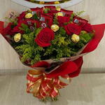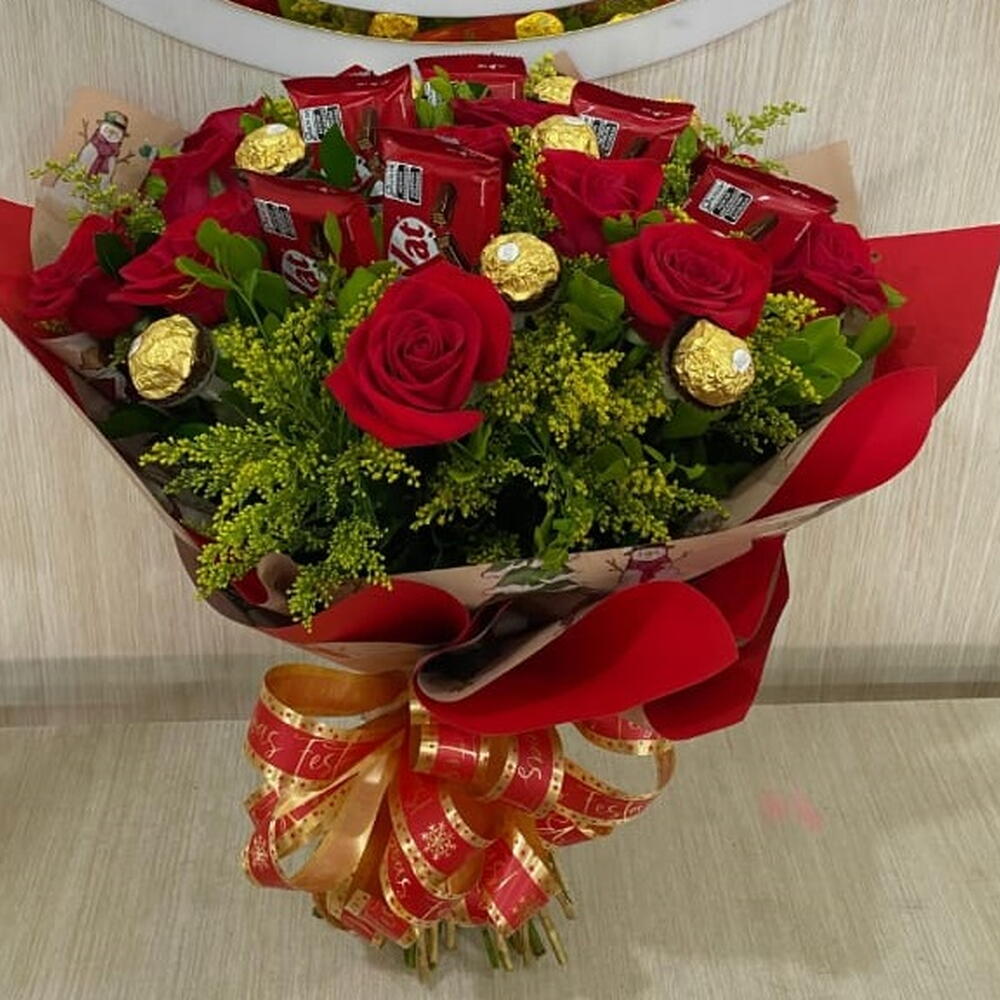 Este pacote de presente é o presente perfeito para surpreender alguém especial. Composto por doze rosas vermelhas luxuosas, escolhidas na perfeição, e um conjunto de chocolates saborosos, que incluem oito Ferrero Rocher e cinco barras de Kit Kat. Para complementar, a caixa elegante e sofisticada com belas folhagens e embelezada com um laço atraente proporciona um acabamento requintado que deixará um impacto maravilhoso. Este presente extraordinário promete entregar amor e felicidade de maneira elegante e deliciosamente memorável.