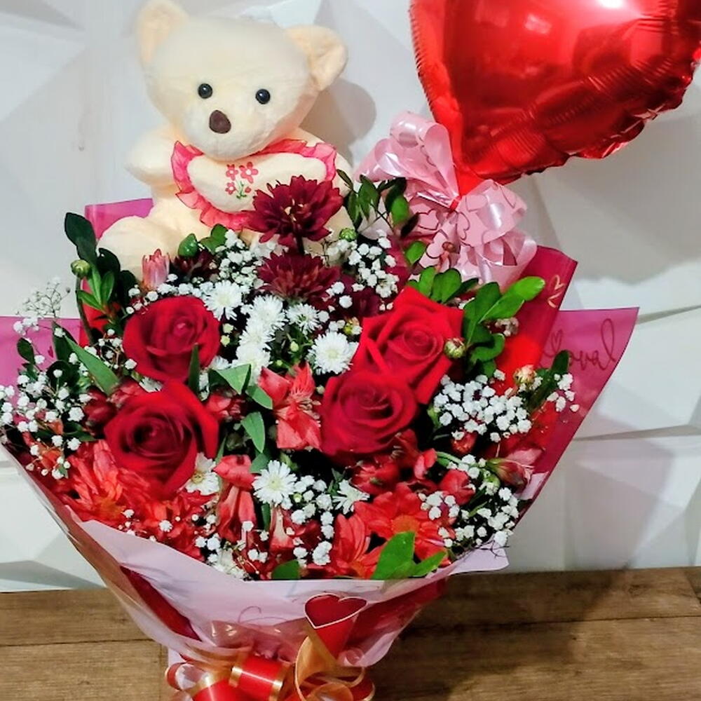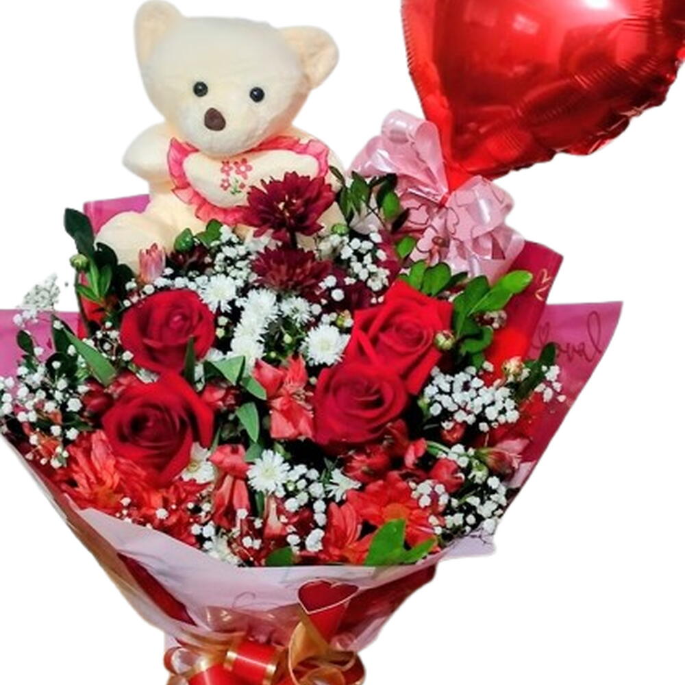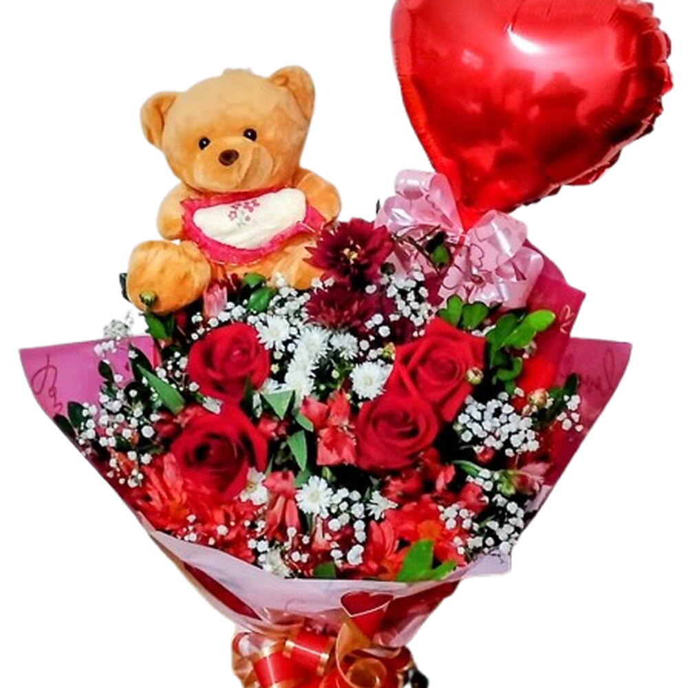 Um presente apaixonante para momentos inesquecíveis ❤️ Buquê exuberante de rosas vermelhas com delicadas flores complementares, acompanhado com Ursinho de 15 cm. O balão em formato de coração e os laços sofisticados deixam tudo ainda mais encantador. Perfeito para surpreender e declarar todo o seu amor com elegância!