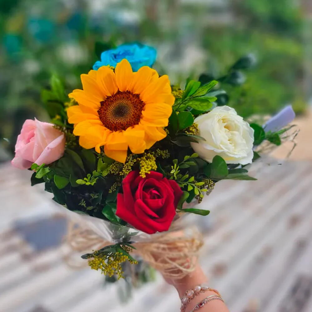 O Buquê Cores do Sol é uma expressão vibrante de amor e alegria, perfeito para qualquer ocasião especial. Composto por um girassol radiante, símbolo de felicidade e energia positiva, ele se destaca com sua beleza marcante. Ao redor do girassol, quatro rosas coloridas — azul, cor de rosa, vermelha e branca — criam uma combinação harmoniosa que encanta os sentidos. As rosas azuis representam a serenidade e a tranquilidade, enquanto as rosas cor de rosa transmitem carinho e amor. As rosas vermelhas, clássicas e apaixonadas, trazem a intensidade das emoções, e as rosas brancas simbolizam pureza e novos começos. Este buquê é uma verdadeira celebração da vida, ideal para surpreender amigos, namorados ou familiares. Além disso, o buquê vem acompanhado de uma cartinha personalizada, onde você pode adicionar sua mensagem especial, tornando-o ainda mais único. O Buquê Cores do Sol é a escolha perfeita para aniversários, casamentos, ou simplesmente para iluminar o dia de alguém querido. Com seu design alegre e colorido, ele é uma forma de expressar sentimentos de maneira encantadora.