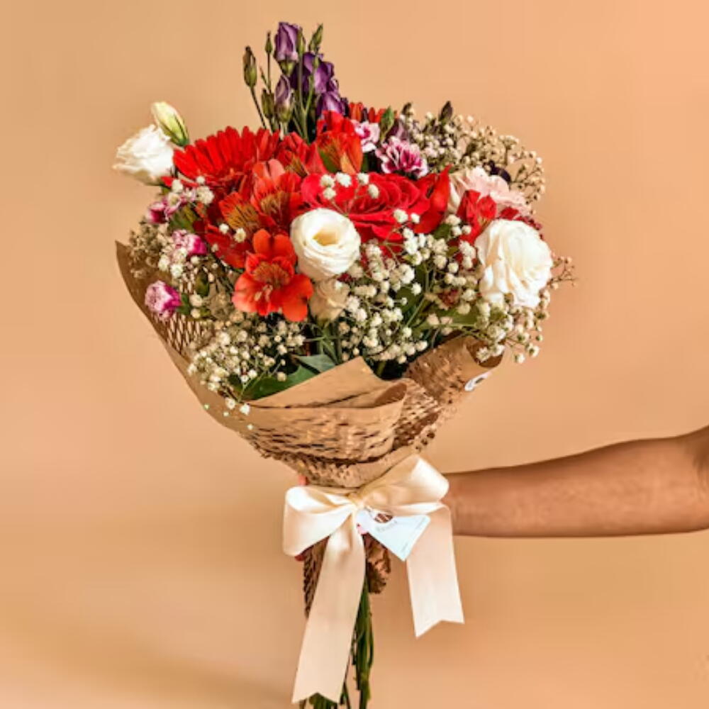 Este buquê é uma esplêndida mescla de Rosas Colombianas, Lizianthus, Cravo, Cravina Astromélia e Gérberas, cuidadosamente harmonizadas com folhagens e complementos que realçam a beleza de cada flor. O arranjo vem delicadamente acondicionado em uma embalagem especial, acompanhado por um laço suntuoso. Cada pedaço deste buquê foi pensado para encantar e expressar sentimentos sublimes através da linguagem universal das flores.