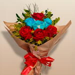 embalagem - 1 pcs folhagens - 1 pcs laço - 1 pcs rosa vermelhas - 4 pcs rosa azuis - 3 pcs