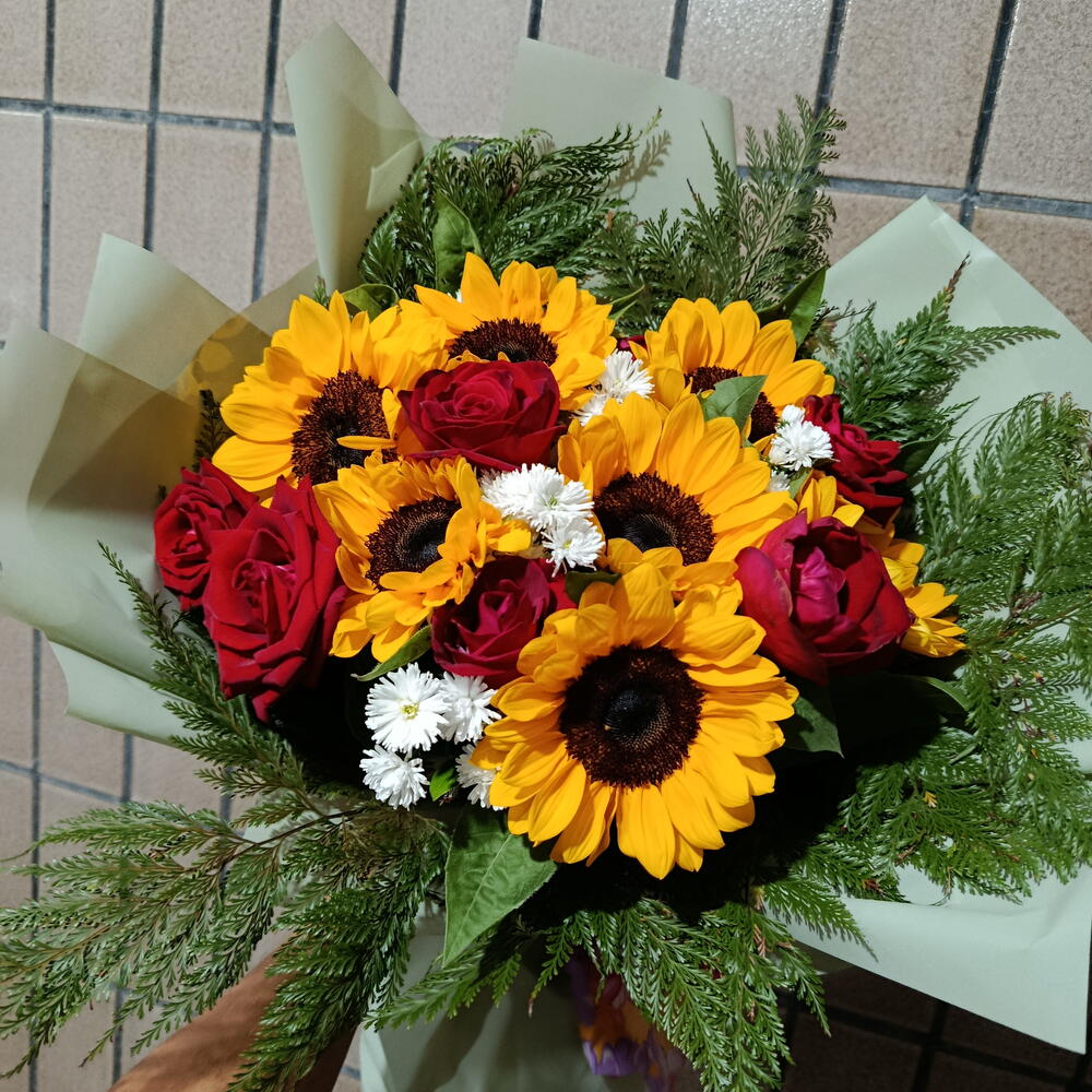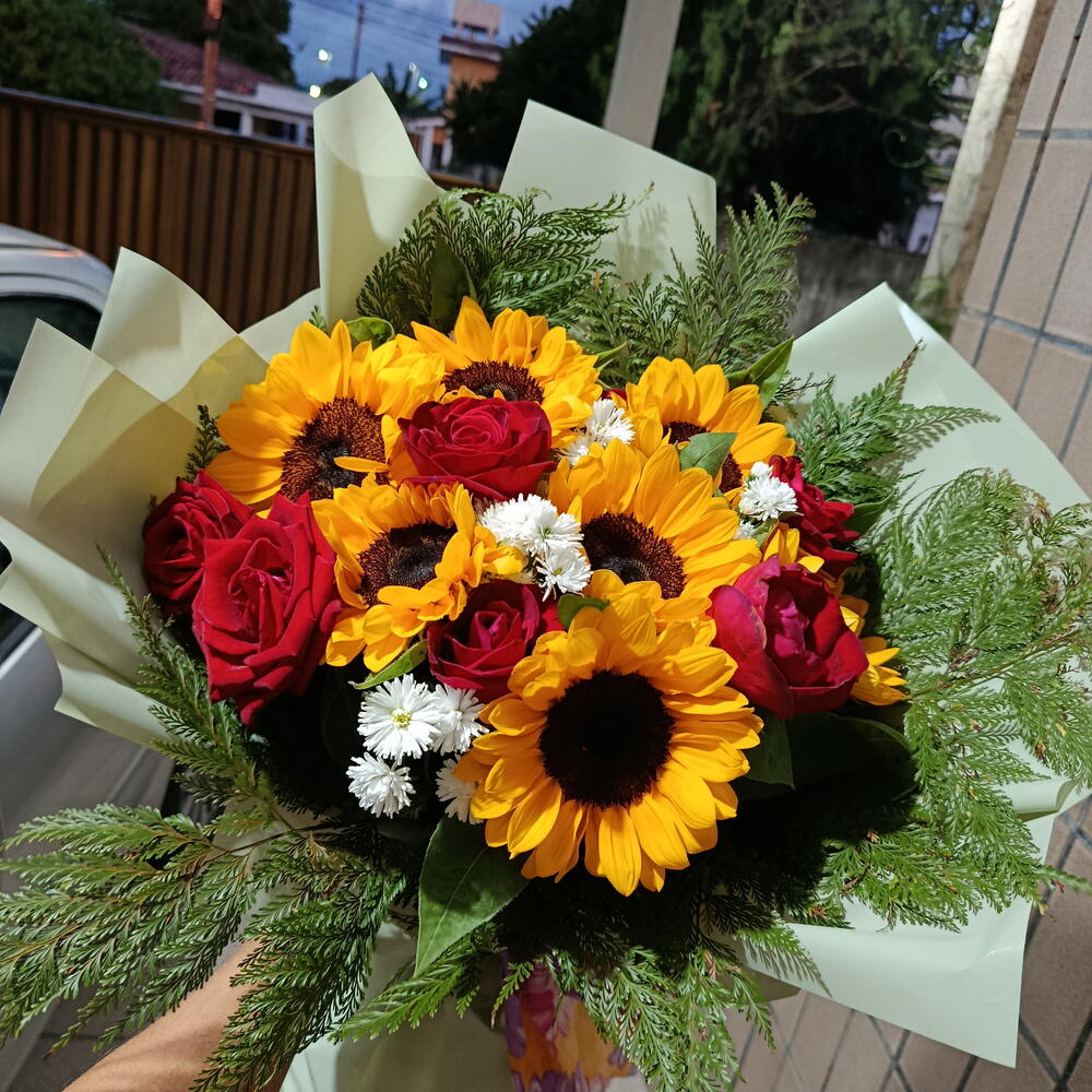 Este encantador buquê é composto por seis girassóis vibrantes e seis rosas vermelhas romantically envolvidas, acrescentando um toque de elegância e paixão. Completando a composição, temos a presença de folhagens verdejantes que acrescentam uma textura interessante. Tudo isso é cuidadosamente embalado em uma linda embalagem com um laço, criando um presente ideal para surpreender em qualquer ocasião.