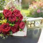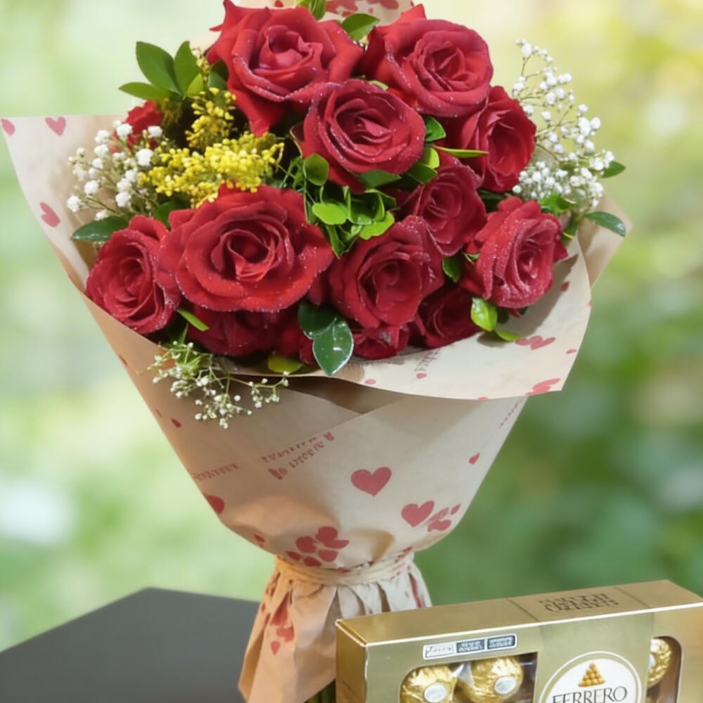 Exiba seu amor com este luxuoso buquê composto por 10 deslumbrantes rosas vermelhas, cuidadosamente selecionadas para representar paixão e desejo. Combinado com uma caixa de Ferrero Rocher, com 8 a 10 unidades, criando uma dupla irresistível que fará o coração de seu amado bater mais rápido. É a escolha perfeita para tornar qualquer momento inesquecível.