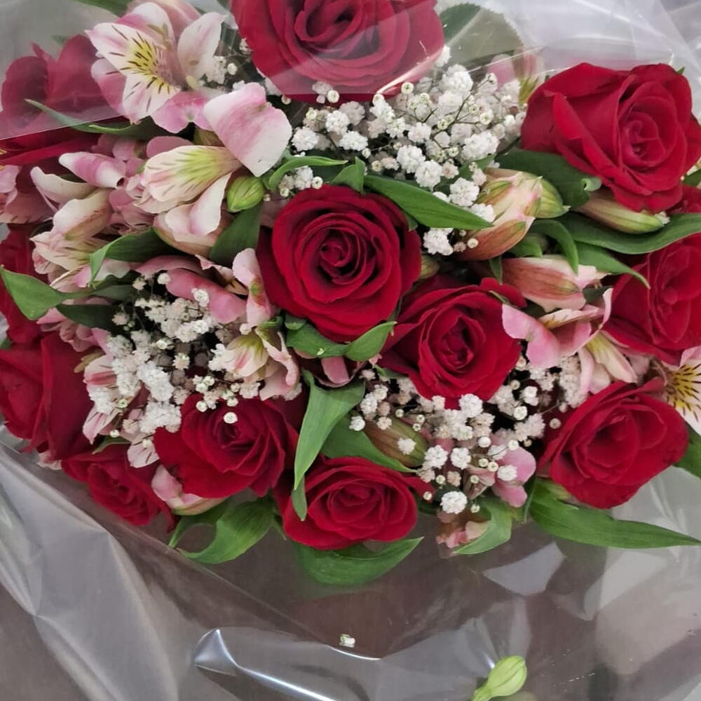 rosa - 12 pcs embalagem personalizada - 1 pcs folhagens - 1 pcs laço - 1 pcs observação: em falta de rosa vermelha podendo ser substituído por outra cor com a mesma beleza e qualidade - 12 pcs