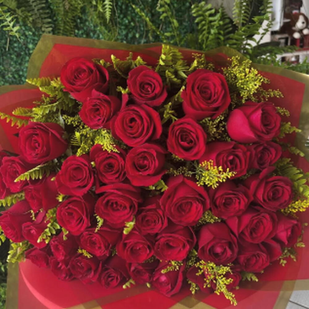 Este belíssimo buquê é composto por 40 rosas cuidadosamente selecionadas, valorizadas por uma linda folhagem. Tudo isso é elegantemente arranjado e envolto por uma embalagem sofisticada e finalizado com um laço charmoso. Um presente perfeito para expressar seus sentimentos mais profundos em qualquer ocasião.
