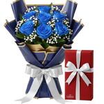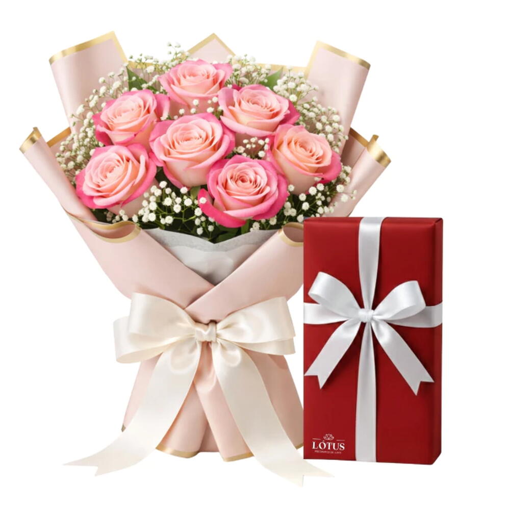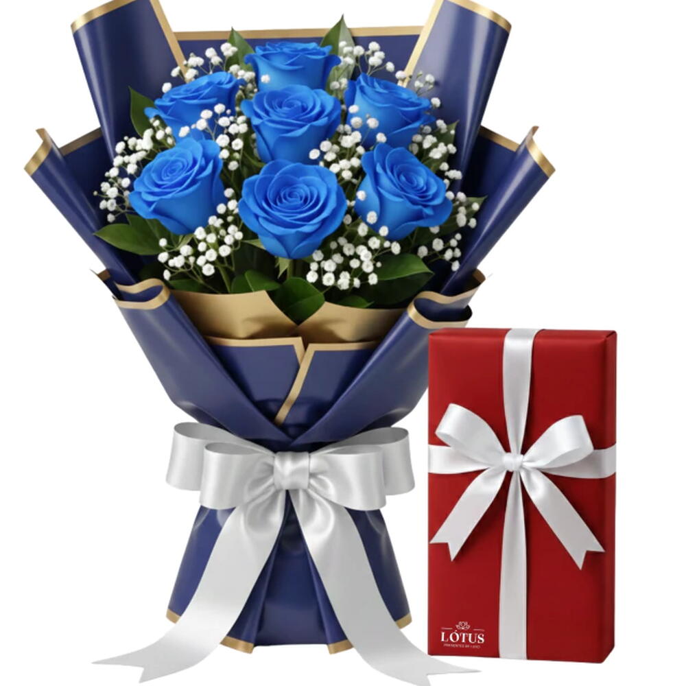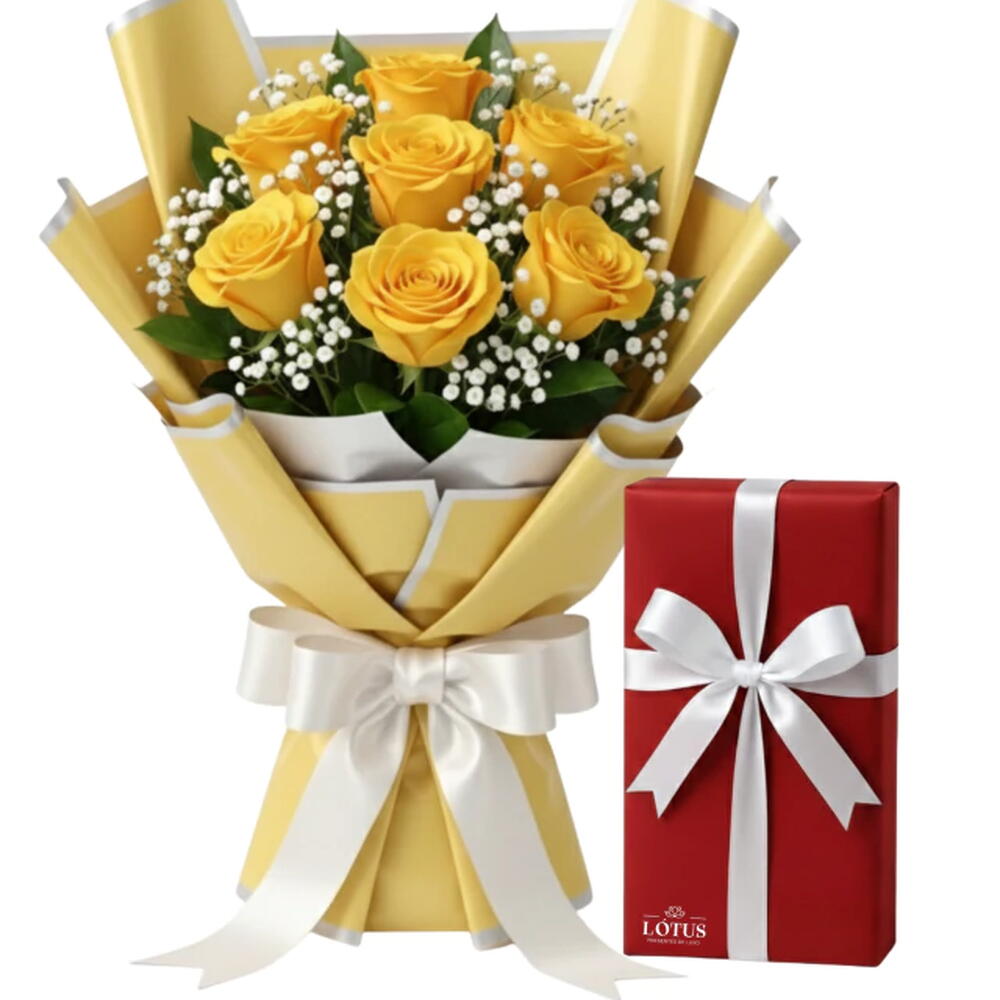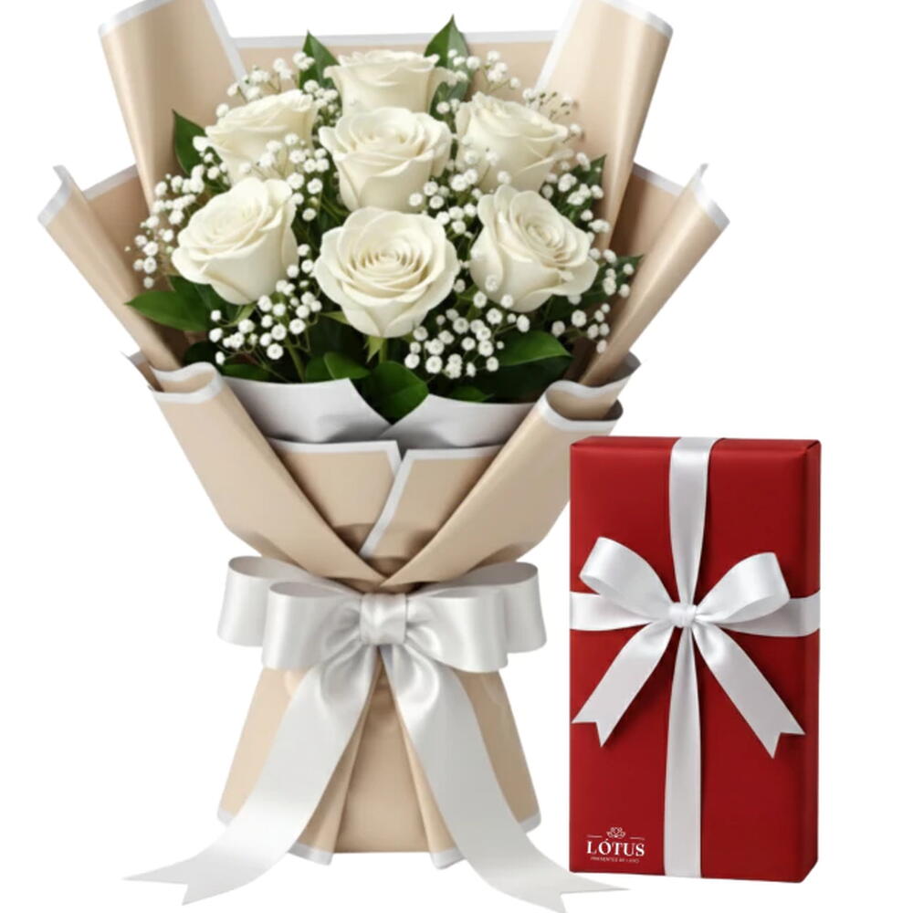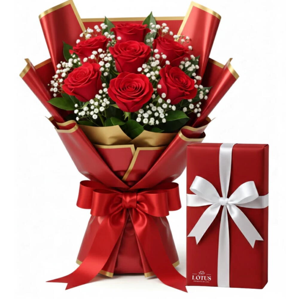 Este presente incrível, composto por uma caixa vintage de bombons requintados, é complementado por sete rosas frescas e exuberantes, cuidadosamente dispostas entre folhagens verdejantes. A embalagem elegante é meticulosamente envolvida e finalizada com um laço sofisticado, para tornar a sua oferta ainda mais especial. Uma combinação perfeita de doçura e requinte.