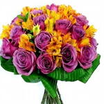 rosa lilases - 12 pcs astroméria amarelas e dracena em volta - 8 pcs